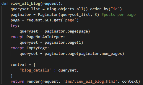 You may have come across a problem of displaying many objects in a single page. Pagination allows you to divide the objects into discrete pages. It is very difficult to show up all the objects in a single page. For example, if you are running a blog website, when you want to list all the post, it is better to divide the posts into pages.